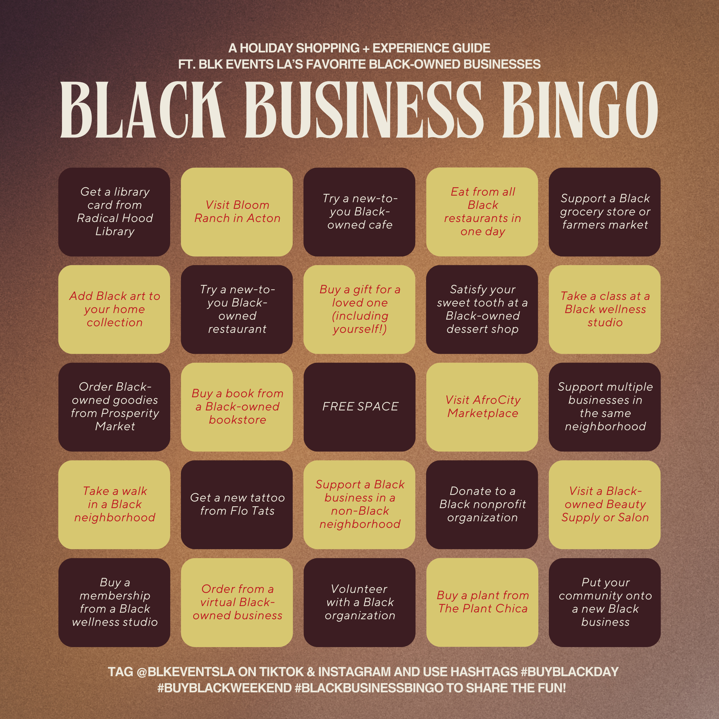 Make it an adventure with Black Business Bingo! Check off your squares with your friends & tag me on socials + use the hashtags #BuyBlackDay #BuyBlackWeekend #BlackBusinessBingo to join the fun. First person to get five-in-a-row wins a prize!